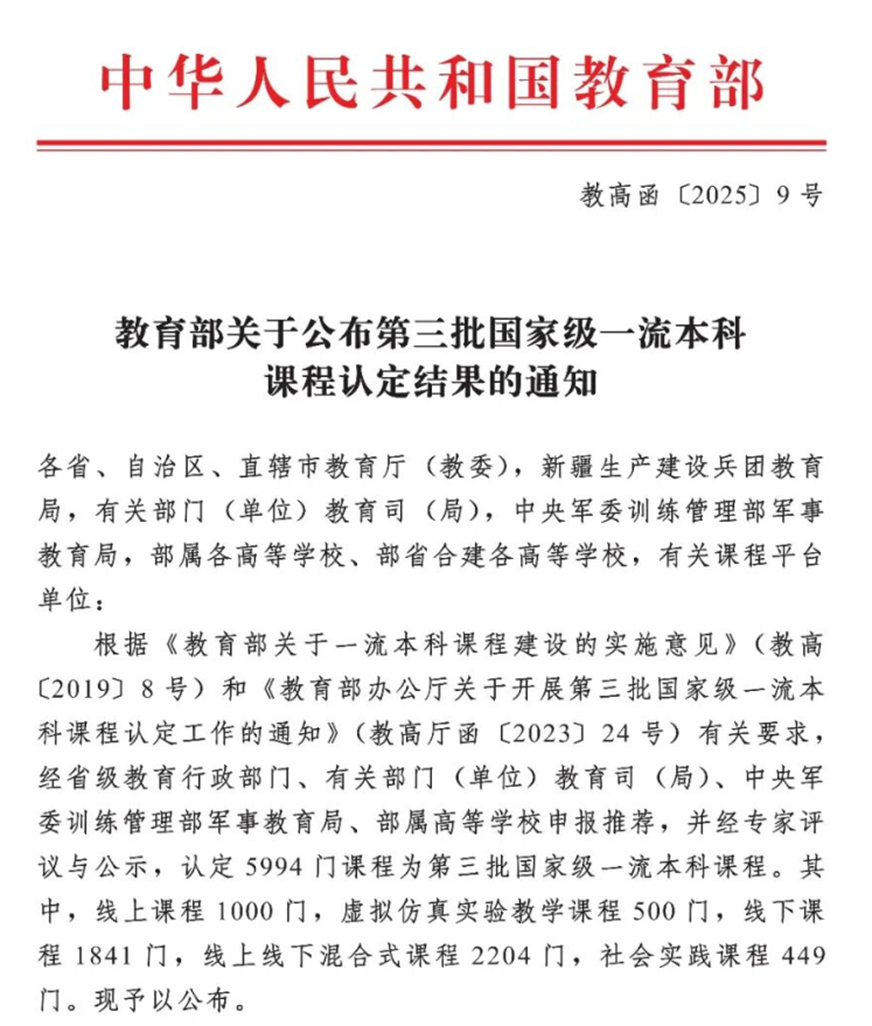近日,教育部印发《关于公布第三批国家级一流本科课程认定结果的通知》(教高函〔2025〕9号),我校《电路理论1》等4门课程入选,其中线上线下混合式课程1门、社会实践课程3门。截止目前,我校共有国家级一流本科课程7门,省级一流本科课程28门,认定校级一流本科课程157门。
